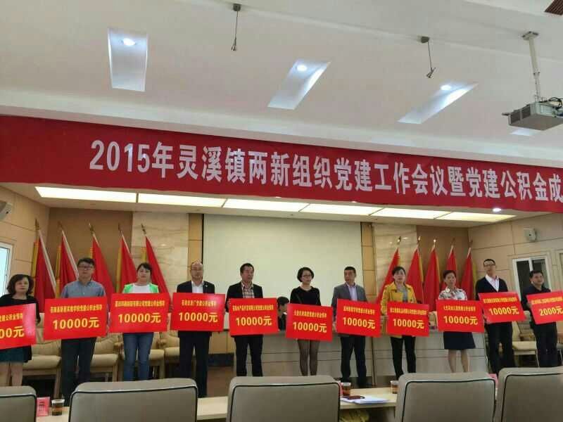 2015年4月26日,天信儀表代表出席鎮兩新組織黨建工作會議及黨建公積金成立儀式。會上,天信儀表集團與其他企業一道上臺,參加黨建公積金的預存舉牌,為靈溪鎮兩新組織黨建公積金注入首筆資金。